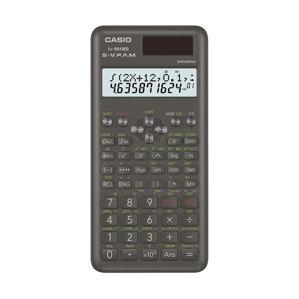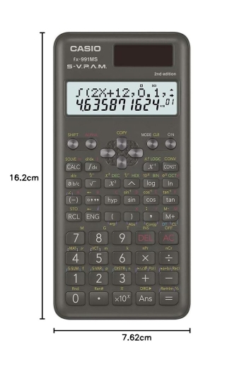 Casio fx-991MS is a non-Programmable scientific calculator with 401 functions. The 2nd edition of the calculator comes in sleek and attractive design. Calculator has dot-matrix display for easy viewing and entering of long algebraic functions and equations. it can solve Trigonometrical, Statistical, Integral, Differential, Matrix, Vector calculations. Calculator is made with wear resistance printing and has drop resistant body. This is powered by Solar & Battery both: Solar powered when light is sufficient, battery powered when light is insufficient.